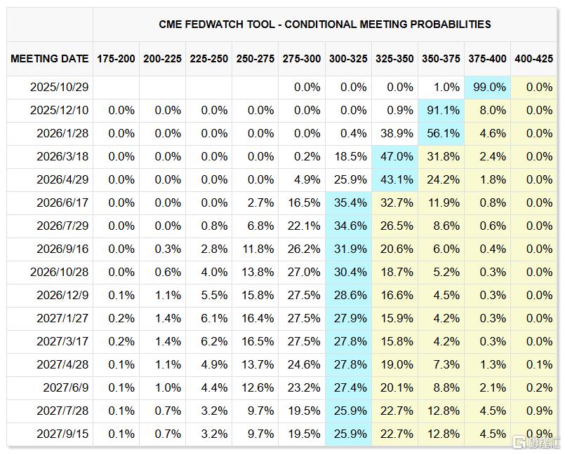 据CME“美联储观察”,美联储10月降息25个基点的概率升至99%。美联储12月累计降息25个基点的概率为9.8%,累计降息50个基点的概率为89.3%,累计降息75个基点的概率为0.9%。
