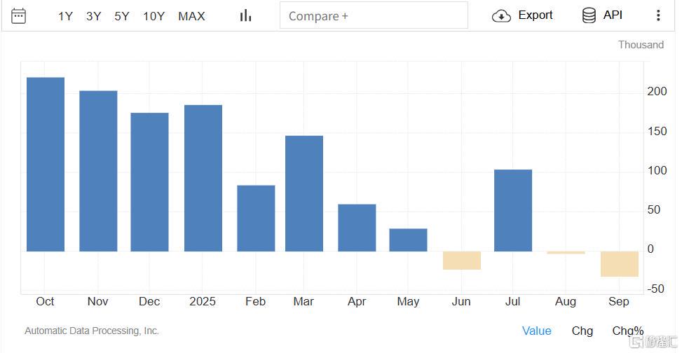 由于美联邦政府停摆,美联储依赖的9月非农就业报告将被迫延迟发布,劳工部周四的周度初请失业金数据也将暂停。这使得ADP的就业报告在市场中的重要性显著提升,而市场普遍预计美联储将在下次会议上再次降息25个基点。