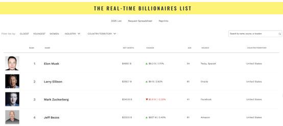 甲骨文公司创始人拉里·埃里森在《福布斯》榜单上排名第二,截至目前,净资产约为3507亿美元。