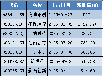 广信科技(920037)上市以来的涨幅超过800%,达到835.84%。江南新材(603124)的涨幅超过700%,达到733.28%;三协电机(920100)的涨幅超过600%,达到686.86%。新恒汇(301678)、影石创新(688775)上市以来的涨幅均超过500%,分别达到544.28%、514.68%。
