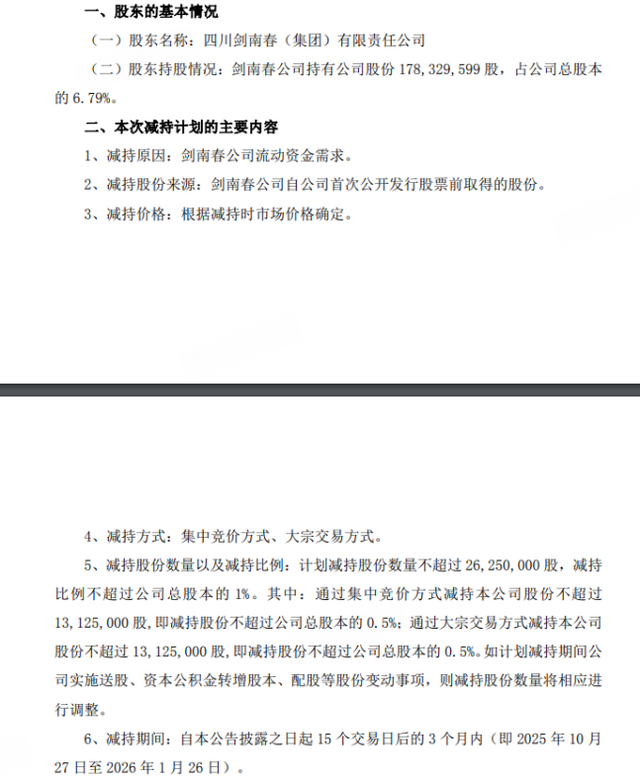 剑南春减持原因是“流动资金需求”。华西证券表示,本次减持计划实施后,公司控股股东、实际控制人均不会发生变化,不会对公司治理结构及未来持续经营产生影响。