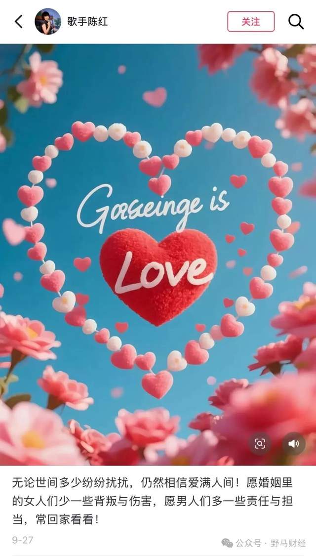 9月27日,陈红在抖音个人账号发文称:“无论世间多少纷纷扰扰,仍然相信爱满人间!愿婚姻里的女人们少一些背叛与伤害,愿男人们多一些责任与担当,常回家看看!”