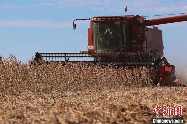 大型农机在黑河大田中收割大豆。