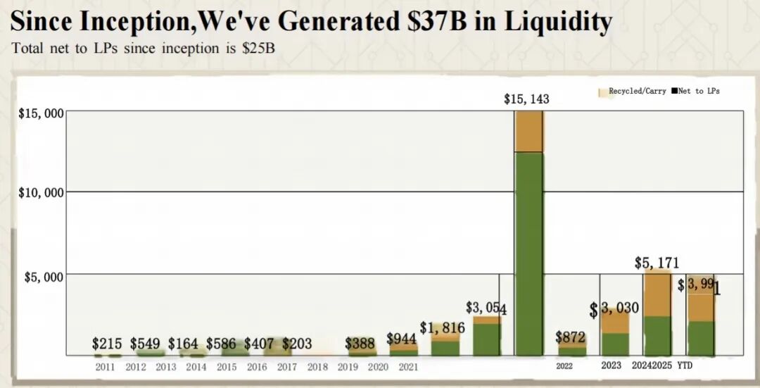 根据这份PPT显示,自2011年以来,A16z为LP们创造的净回报,也就是扣除管理费和carry这些七七八八,已经累计达到了250亿美元(约合1780亿元人民币)。总共赚的“现金”,更是高达370亿美元(约合人民币2630亿元)。