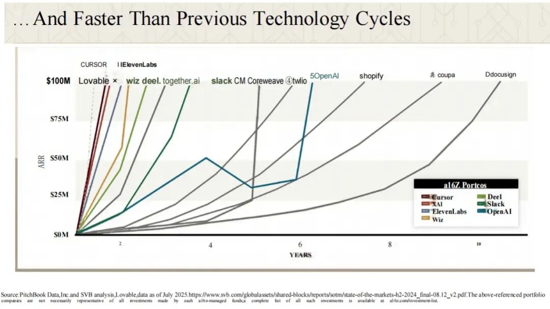 第二个原因在于,他们通过数据分析发现人工智能企业的成长周期更快,相较于其他赛道,一个初创企业收获1亿ARR(年度经常性收入)的用时越来越少,他们近期的被投企业Cursor、Lovable(也是一家AI编程工具)、Wiz、Deel就是例子——这其中Wiz在今年被谷歌已经宣布以320亿美元收购,可以帮A16z很好地展示“AI时代”的风投退出速度。