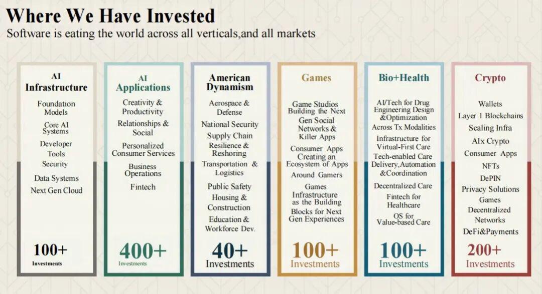 其次根据他个人的说法,他拿到的文件更新于2025年5月,而事实上2025年4月,确实有大量商业媒体爆料称A16z正在寻求一轮整体规模为200亿美元的募资。另外,根据2025年4月当时的报道,A16z这次新设立的基金主要投资于来自美国的人工智能企业,并着重希望能够吸引美国市场之外的国际资本来参与本次募资,而目前流传的这份说明文件里确实在“投资领域”一页中将“人工智能基础设施”“人工智能应用”“美国活力”标注为前三序列。