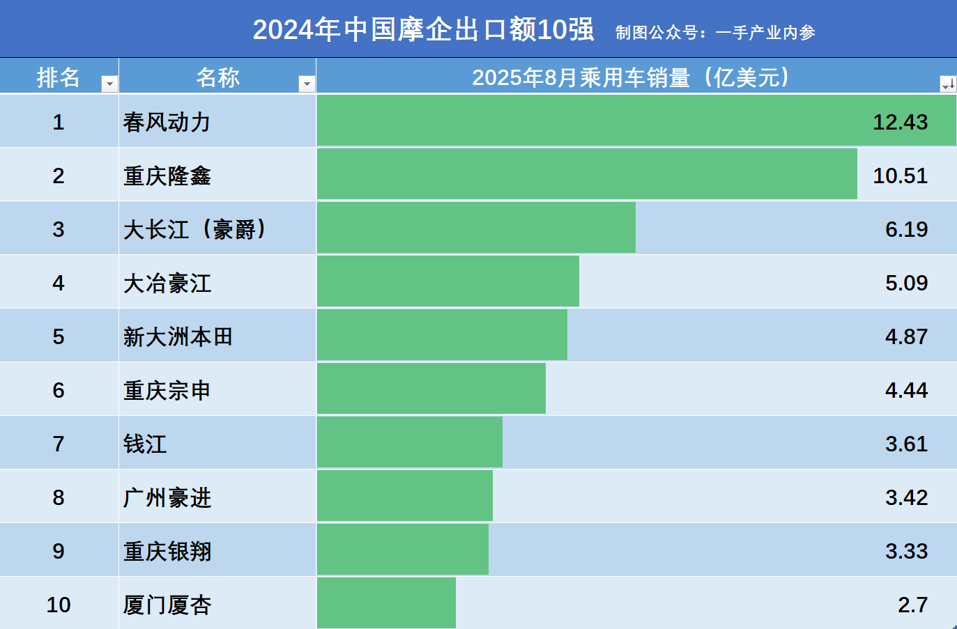 另附:2024年中国摩企出口金额10强厂商,数据源于:中国摩托车商会。