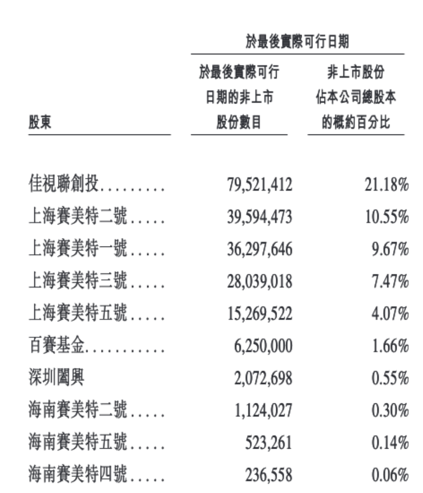 李钢江及倪琼,连同管理层股东(即佳视联创投、百赛基金、上海赛美特一号、上海赛美特二号、上海赛美特三号、上海赛美特五号、海南赛美特二号、海南赛美特四号及海南赛美特五号)、上海佳瑞佳妮、佳佳控股、佳视联私募及深圳阖兴为本公司控股股东集团。此外,赛美特股东还包括华为旗下哈勃投资、红土善利、中网投、比亚迪、创启开盈、韦豪鋆轩、上海科创基金、天善知行、长三角基金、上海辰钧、北京裕润、无锡崇纬、立昂微及G60科创基金等。