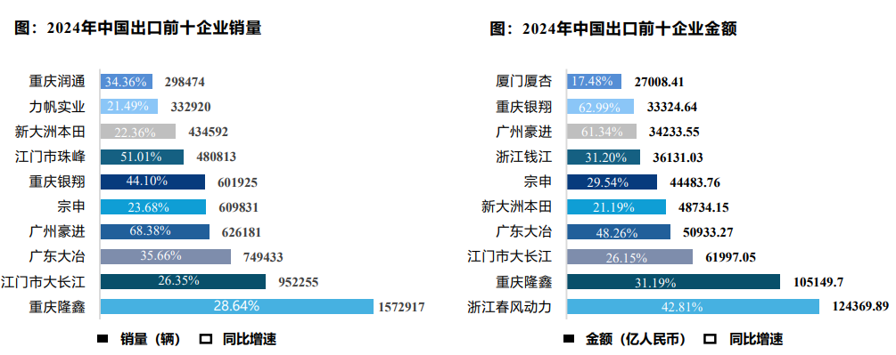 事实上,2024年我国摩托车平均出口单价仅为601美元/辆,原因也是如此。出口量排名靠前厂商主要是隆鑫、大长江、大冶豪江等。