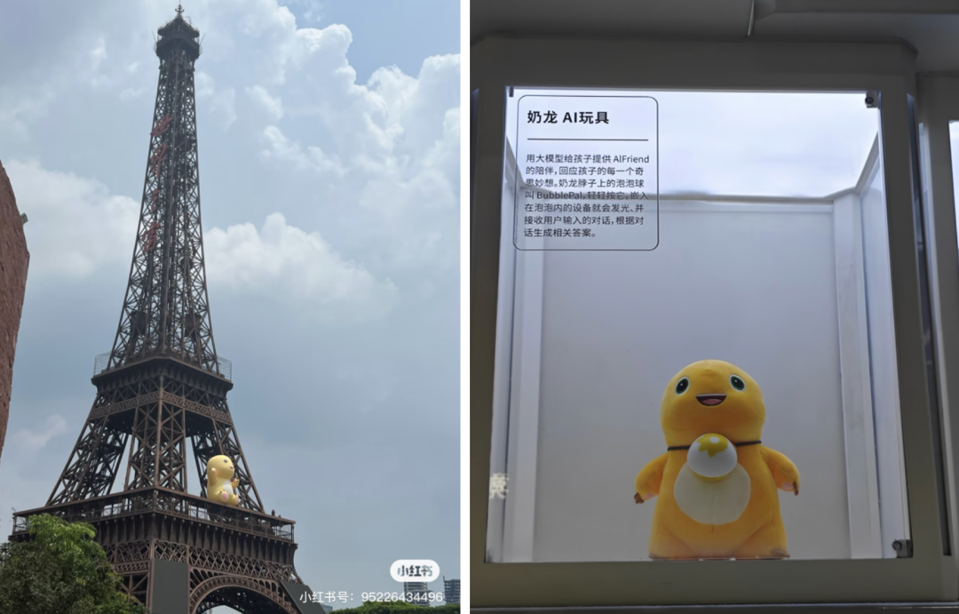 两年前,自在光明大仟里开启深圳首站巡演后,奶龙各种出圈名场面接连袭来:不在巴黎在深圳,谁能想到奶龙有一天在埃菲尔铁塔夺得c位;金铲铲四周年生日派对快闪活动,作为胖胖龙的表弟,奶龙也是举着铲子就来凑热闹了;正儿八经的科学技术馆,奶龙走向next level,玩起了AI交互;更有港人北上山姆,售价999元的1.5米奶龙成为新晋时尚单品。