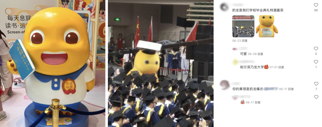 而这位“龙”星还马不停蹄地闯进学术赛道。前脚穿着深圳校服的Q版小龙还在陪小孩读书,后脚五岁的奶龙就换上学士服现身大学毕业典礼现场。黄领学士服一朝之间竟成为痛衣,信徒们不免惊讶,奶龙怎么就背着自己考上985院校了。