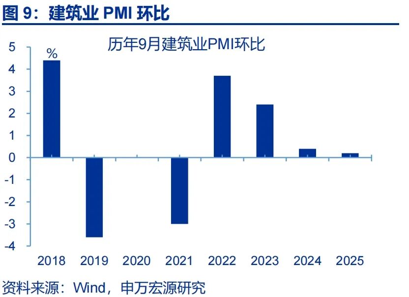 非制造业方面,建筑业PMI持续低迷,服务业PMI受暑期效应消退的影响也有回落。9月,非制造业PMI降至临界点。其中,建筑业PMI仅较前月回升0.2个百分点,整体仍在历史低位(49.3%)。服务业PMI较前月回落0.4pct至50.1%。从行业看,受暑期效应消退影响,与居民出行消费密切相关的餐饮、文化体育娱乐等行业商务活动指数落至临界点以下;对比之下,邮政、货币金融服务等行业商务活动指数位于高位景气区间。