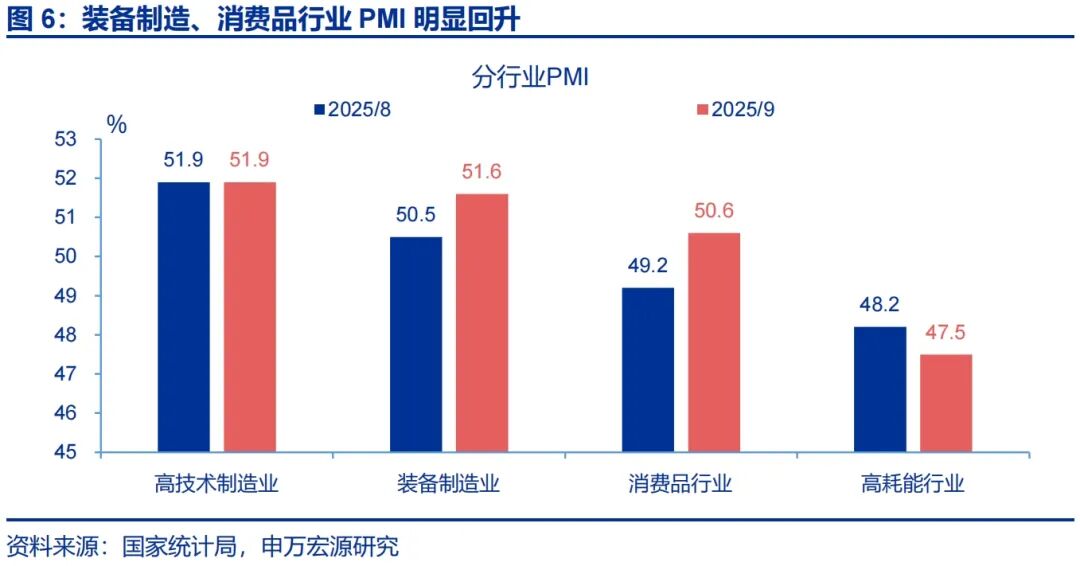 观察行业看,代表新动能行业的PMI改善幅度较大,一定程度对冲传统领域的PMI低迷。9月,装备制造业PMI上行1.1pct至51.6%,高技术制造业PMI保持在扩张区间(51.9%),显示出新动能积极改善。相比之下,高耗能行业PMI回落0.7pct至47.5%,或反映地产基建仍偏弱;相应地,前期回升幅度较大的基础原材料行业购进价格指数、出厂价格指数分别较上月下降2.2、4.5pct,9月PPI环比或有再度转弱的风险。