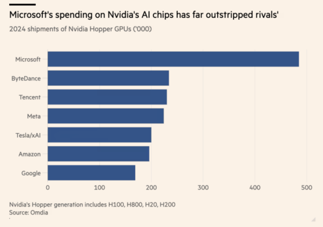 另一家巨头微软也是GPU的大买家。科技咨询公司 Omdia 的分析师估计,微软在去年购买了48.5万块英伟达的“Hopper”芯片。这使得微软远远领先于英伟达的第二大美国客户 Meta(购买了22.4万块 Hopper 芯片),以及其云计算竞争对手亚马逊和谷歌。