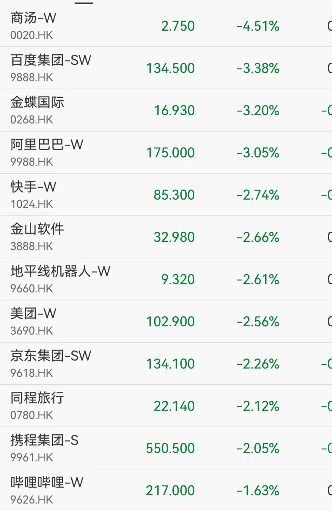 商汤跌超4%,阿里、百度跌超3%,金山软件、京东跌超2%。