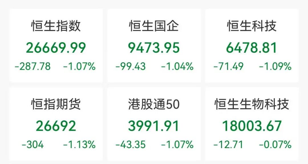 10月8日,港股开盘大幅回调。截至午盘收盘,三大指数跌超1%,其中恒生科技指数一度跌超2%。