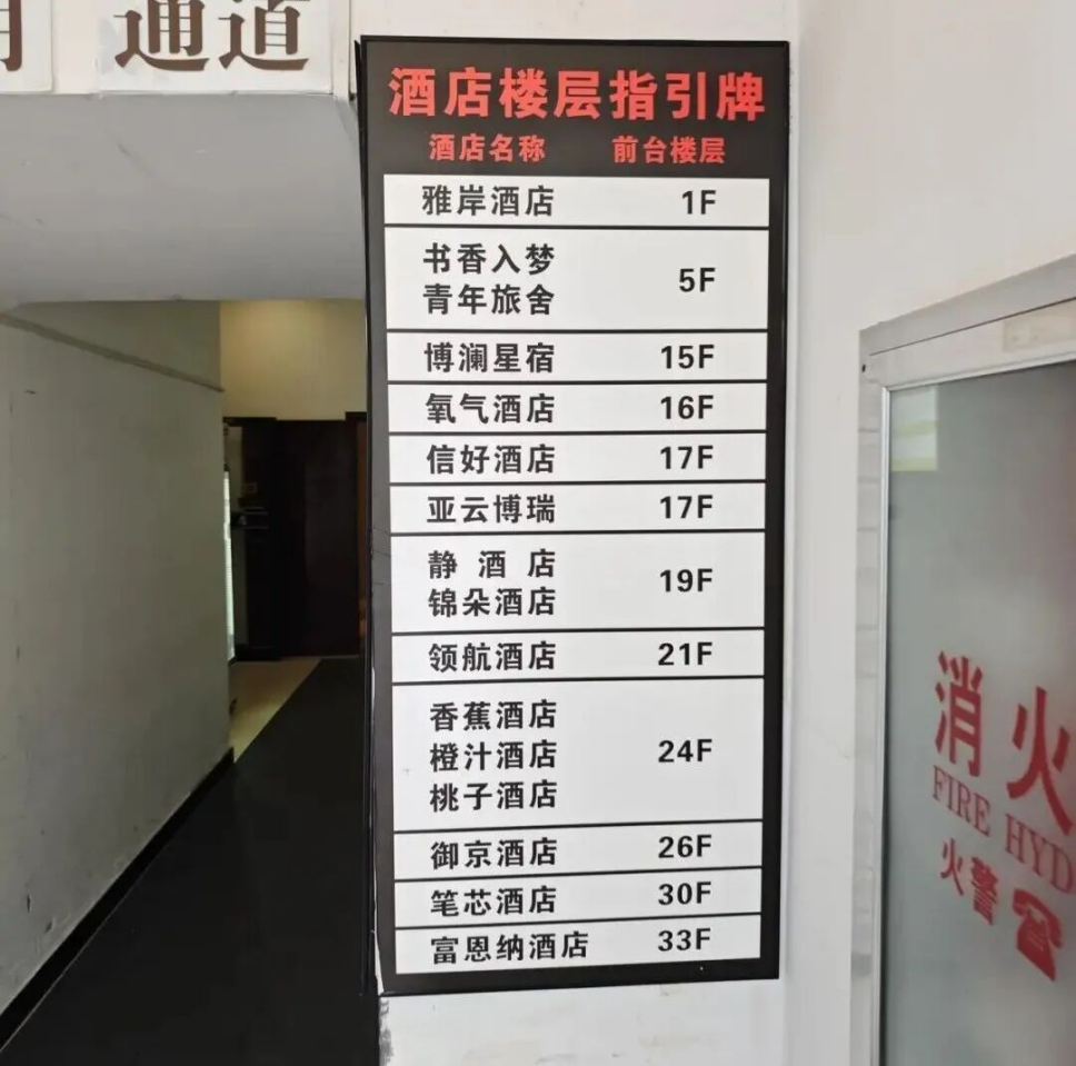 以杭州的一栋高层大楼为例,整栋楼内分布着十余家酒店,几乎实现了“每层一家”的密集布局。更有甚者,部分公寓楼出现了多家酒店共享一个大堂,仅通过楼层进行区隔的经营模式。