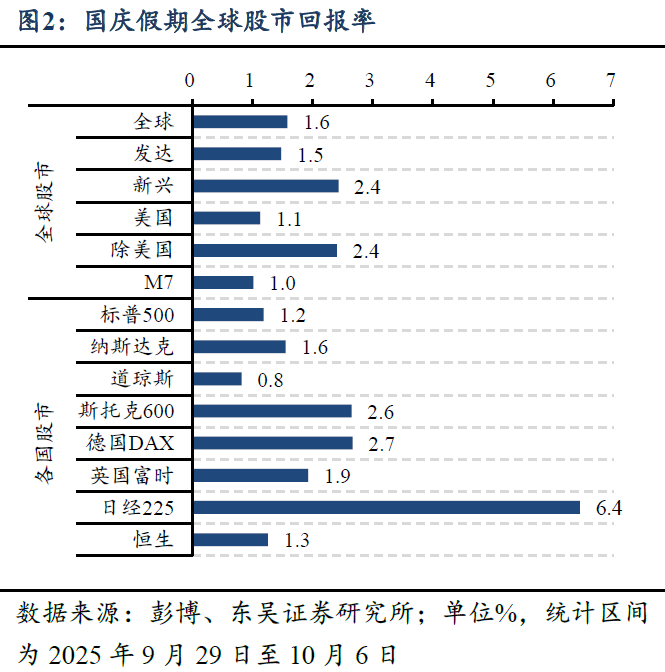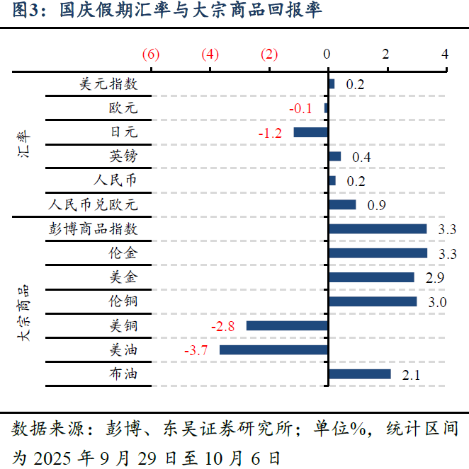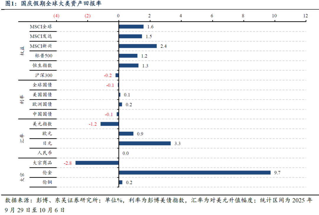 大类资产:比特币与黄金再创历史新高,美股连续上涨,全球股市普涨,表现为典型的“宽财政+宽货币”交易。国庆假期前后(9月29日至10月6日),全球大类资产的表现体现为典型的“宽财政+宽货币”组合交易:比特币与黄金为首的大宗商品领涨,全球股市普涨,美债利率震荡,美元指数上涨、欧元与日元下跌。其中,美国政府陷入停摆并引致美国重要数据暂缓发布、高市早苗胜选日本自民党总裁是两大主要驱动事件。具体来看,10月1日,美国联邦政府因未按时通过临时支出法案而停摆,且停摆时间预计将比市场预期更长,避险情绪令黄金和比特币上涨;与此同时,因政府停摆期间9月非农数据暂停发布、9月CPI数据可能继续延后发布,市场对于10月FOMC会议美联储“盲降息”的预期升温;10月4日,高市早苗当选日本自民党总裁,其宽财政和较为温和的宽货币主张进一步推升全球财政宽松预期,黄金与比特币继续大涨,二者分别突破3960美元/盎司、15万美元关口,创下历史新高,伦铜则创下2024年6月以来新高。权益资产方面,美股风险情绪暂未受到政府停摆风险的冲击,而是更多交易经济数据缺席所体现的“没消息就是没消息”,在科技和医药股的领涨下,标普500和纳斯达克指数均创下历史新高,标普500指数录得7连涨;受益于高市早苗胜选的宽财政和宽货币预期,国庆假期(9月29日至10月6日)日经225指数上涨6.4%,创下历史新高。