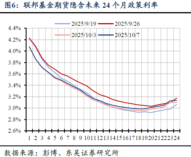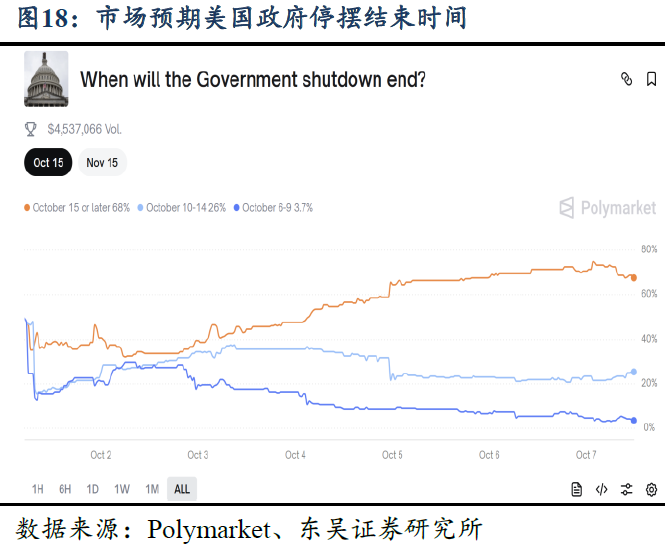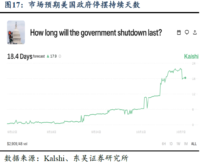 美国政治:联邦政府再度停摆,持续时间较市场预期或更长,经济数据发布时间延后。美东时间2025年10月1日,因临时支出法案未能在参议院通过,美国联邦政府正式进入关门状态。具体来看,本次联邦政府“停摆”源于两党在医保支出上的分歧:共和党主张通过约1.5万亿美元,不含医保补贴的短期拨款,以维持政府运转至11月21日,并将医保补贴等争议留至12月进行协商;而民主党则坚持将延长《平价医疗法案》(ACA)补贴相关条款纳入法案。停摆期间,两党曾于10月3日在参议院再度就支出法案进行表决,但仍未能通过,双方谈判陷入僵局。从影响来看,①联邦政府停摆对经济的负面作用较为有限:以上次政府停摆(2018年12月22日至2019年1月25日)为例,CBO的研究显示停摆令美国实际GDP减少约0.1%-0.2%,但这一损失在政府恢复运作后大部分得到回补。②特朗普正利用政府停摆推进裁员计划:国会预算办公室(OMB)表示,本次政府关门预计将临时解雇约75万人。而特朗普已经指示OMB向各个联邦机构发出备忘录,要求将部分符合条件雇员由“临时解雇”转向“永久裁员”。尽管该指示暂不具备强制效力且涉及人数未知,但若特朗普能借本次停摆推进其政府裁员计划,则仍将给美国劳动力市场带来额外压力。③政府停摆的负面影响同样体现在经济数据发布的延后:受停摆影响,BLS宣布原定于10月3日公布的9月非农就业数据将延期发布,具体发布时间待定。截至最新合约交易网站Kalshi预测本轮联邦政府停摆将持续约18天,Polymarekt预测停摆持续至10月15日及以后的概率为68%。因此BLS原定于10月15日公布9月CPI数据也将大概率面临延期。非农就业与CPI作为对美联储货币政策决议起决定性作用的关键数据,其延期发布令市场短期内陷入“无消息”状态。但市场对“无消息”的理解偏中性,既未当作“好消息”也未当作“坏消息”进行交易。10月1日以来,联邦基金期货交易员预期全年降息次数由1.89次减少至1.82次,变化幅度较小。