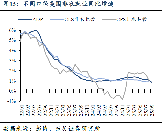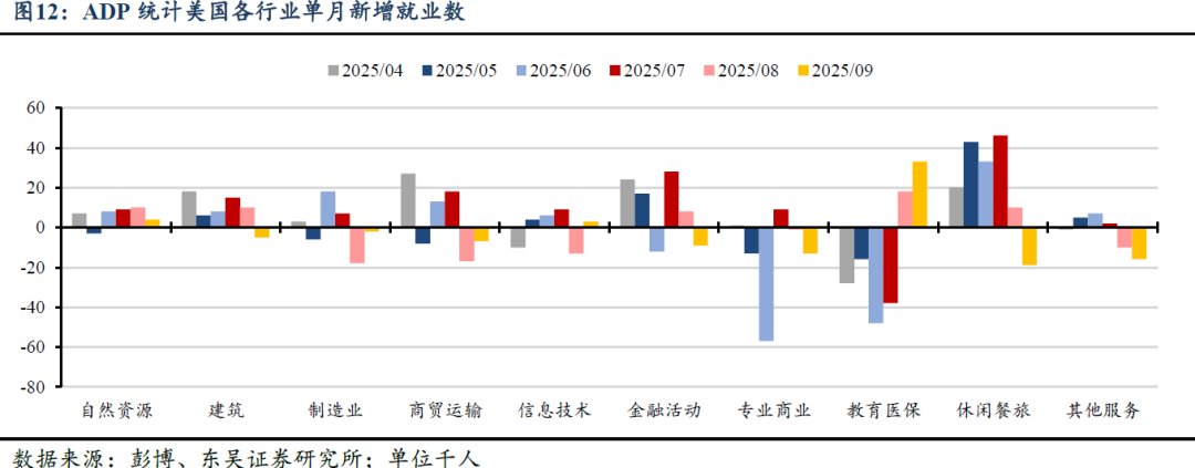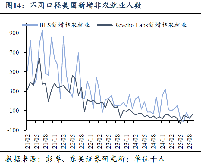 海外经济:美国非农就业数据暂缓发布,ADP就业再度负增长,ISM制造业和服务业指数表现分化。因美国联邦政府自10月1日起停摆,由BLS、BEA、US Census等政府机构发布的美国经济数据暂停发布,迄今已受到影响的数据包括9月美国非农就业、首申失业金、8月工厂订单、建筑开支等数据,而美联储、私营部门发布的数据则不受影响。国庆假期前后,美国公布的职位空缺、ADP就业数据以及PMI、消费者信心等景气数据喜忧参半。景气指数方面,9月美国ISM制造业和服务业PMI分化:ISM制造业PMI改善至49.1,预期49,前值48.7,其中新订单、新出口订单指数显著收缩,生产指数则是环比最大增项,主要来自上月新订单的增长;服务业PMI降至50,预期51.7,前值52,其中商业活动、新订单、库存指数均显著收缩。从ISM报告中调查者评论来看,关税对需求、资本开支和企业成本的压力在9月突显。此外,9月美国咨商会消费者信心指数意外降至94.2,预期96,其中现状和预期指数均下跌。就业数据方面,9月30日公布的职位空缺数基本符合预期,较前值小幅抬升;但10月1日公布的ADP私营就业数据环比减少3.2万,大幅不及预期的增长5.1万,前值由5.4万下修至-0.3万。分行业看,教育医保就业环比+3.3万,仍是就业增长的主要贡献项,而除自然资源、信息技术、教育医保外的其余7大类行业就业均录得负增长。由于非农就业数据的缺席,作为私营就业数据的补充,Revelio Labs从美国在线就业数据中统计的美国9月非农(政府+私营部门)就业+6.1万,其中就业增长主要来自教育医保和零售业。值得注意的是,从相关性来看,ADP私营就业与Revelio Labs就业与非农就业数据的相关性并不算高,R2均在55%左右。此外,芝加哥联储根据实时数据测算的数据预计9月美国失业率为4.34%,8月前值为4.32%。