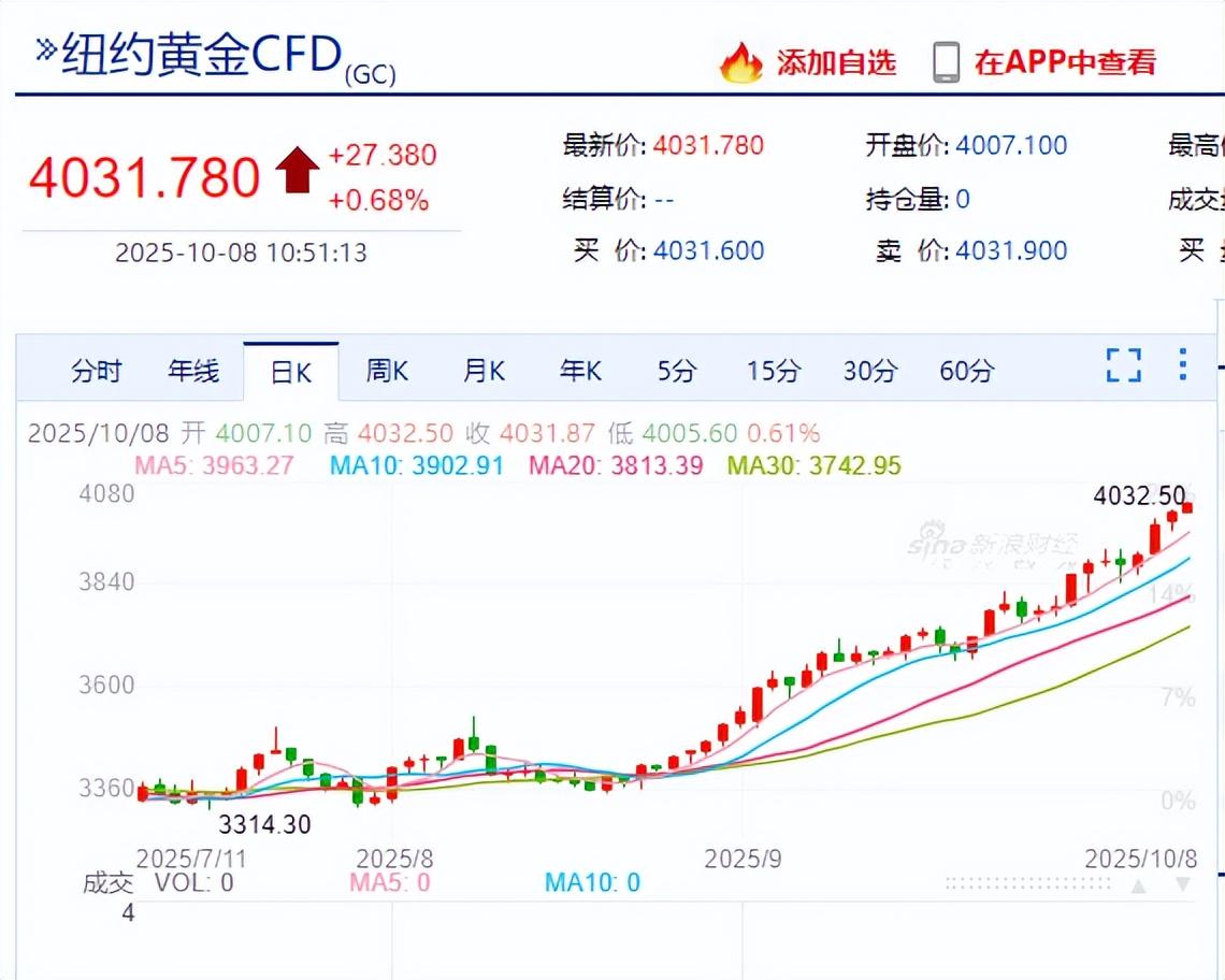 今天上午10点50分,国际黄金期货价格飙升到了4032.5美元/盎司,创出历史新高!