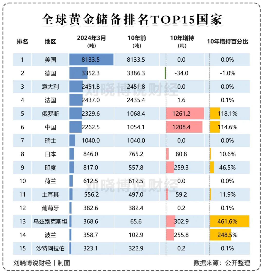 上图是2014年到2024年3月期间,各国央行增持黄金的情况,俄罗斯和中国增持量最大。