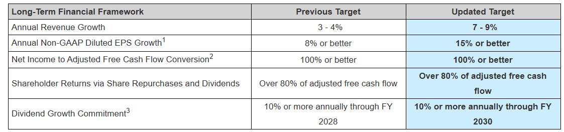 本周二在纽约举行投资者会议前,戴尔公布了更新的"长期财务框架",将年度营收增长预期从此前的3%-4%大幅提升至7%-9%,调整后每股收益(EPS)增长目标从8%或更高提升至15%或更高。新预期将延续至2030财年。