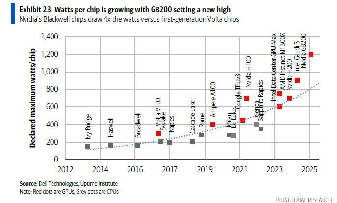 革命的根源,是单颗芯片功耗的指数级飙升。从英伟达的第一代Volta架构到如今的Blackwell架构,单颗GPU的功耗在短短数年间增长了4倍。这背后的物理定律简单而残酷:在芯片上集成更多晶体管、并以更高时钟频率运行,必然导致功耗的线性增长。
