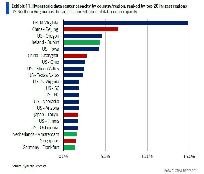 从全球产能分布来看,美洲地区占据了全球过半的电力容量,其中,美国东海岸的北弗吉尼亚州,以其近15%的全球超大规模数据中心容量,成为无可争议的全球最大单一聚集地。紧随其后的是咱们中国的北京,约占7%。