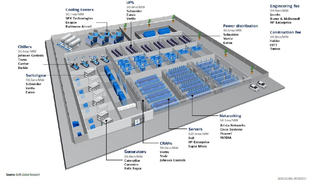 初始投资:建设一个1兆瓦(MW)容量的数据中心,土地、电力接入等前期成本约为200万美元,而包含建筑、机电、散热等设施在内的“动力外壳”(powered shell)成本约为1100万美元。合计每兆瓦的总投资约为1300万美元。