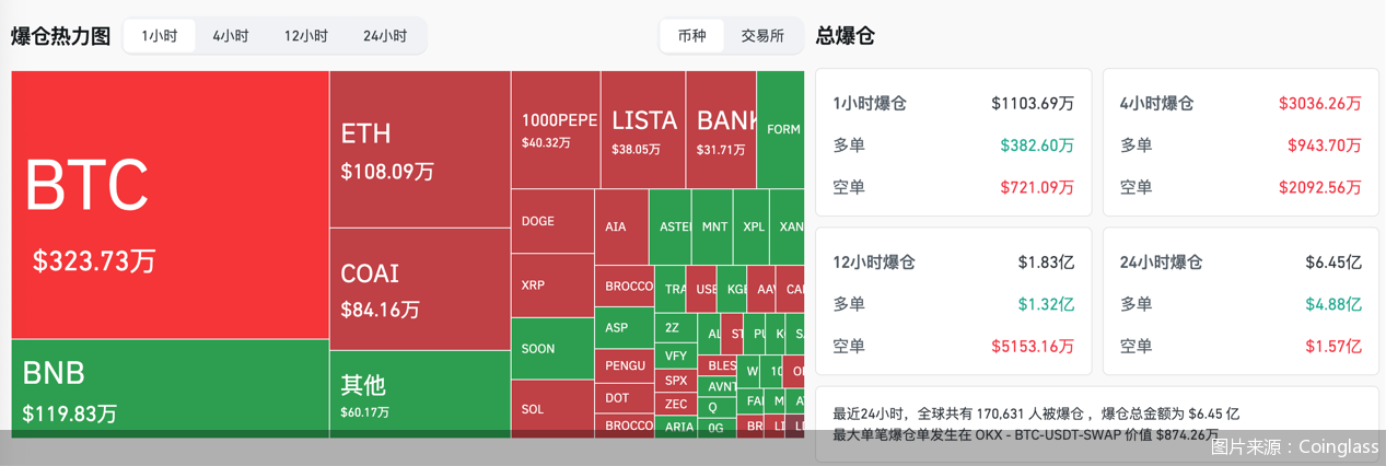 避险情绪下,被拥趸视为"数字黄金"的比特币,近期和黄金在价格走势上呈现了一定的一致性。值得注意的是,在比特币价格的大幅波动下,市场爆仓同样呈现加剧态势。根据Coinglass数据,截至10月8日17时30分的过去24小时里,全球共有170631人被爆仓,爆仓总金额为6.45亿美元,约合46亿元人民币,其中最大单笔爆仓单交易金额为874.26万美元。