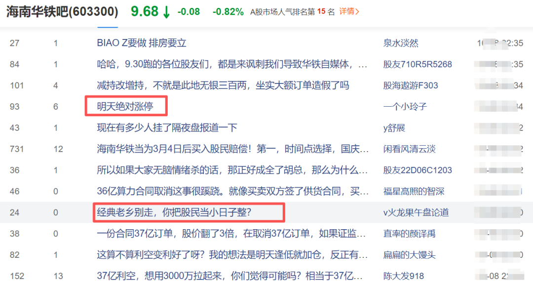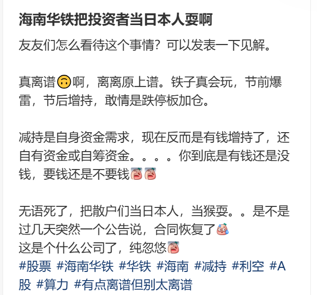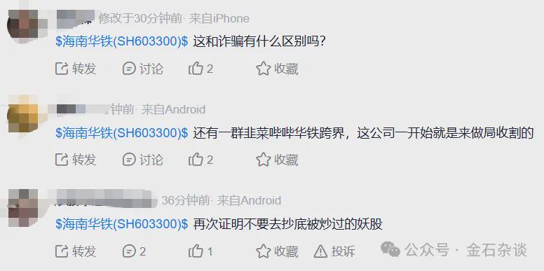有股民甚至猜测本次增持背后的玄机: 怕自己减持跑不了,没散户接盘,又改增持了?真会玩,三千万还想稳股价?3个亿也稳不了,不要把散户当韭菜来回割;真聪明,几个跌停板下来,总经理得少几亿。想用35千万,挽回损失,海南华铁最会玩心眼的公司;经典的老乡别跑,你把股民当小日子整?