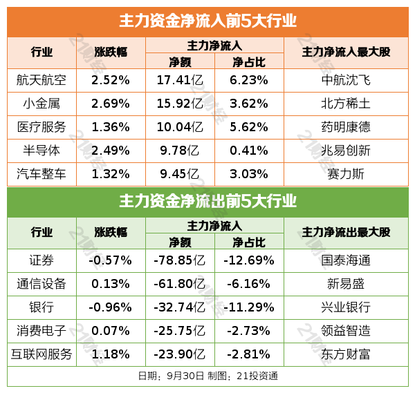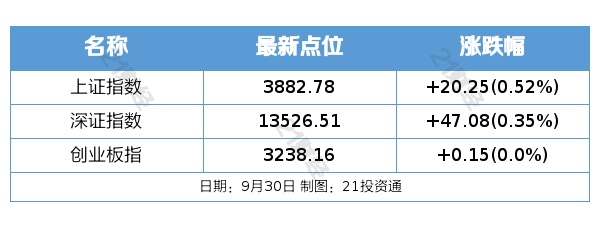 9月30日盘面上,沪深两市成交额2.18万亿元,较上一个交易日放量200亿元。市场热点题材反复活跃,有色金属、存储芯片板块涨幅居前,白酒、大金融等板块跌幅居前。截至收盘,沪指涨0.52%,深成指涨0.35%,创业板指涨0.00%。