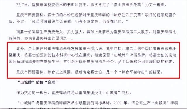 当年嘉士伯为收购重啤,击败百威、华润等竞争对手,信誓旦旦地给出了五大承诺,包括将嘉士伯中国区管理总部搬迁至重庆;将嘉士伯亚洲技术科研中心设在重庆;继续保留、壮大"山城牌"啤酒;将高端国际品牌啤酒安排在重庆生产;重组后确保重庆啤酒各子公司员工队伍和公司管理团队的稳定。