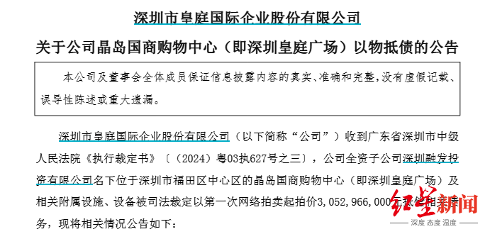 昨日晚间,皇庭国际(000056.SZ)公告称,公司收到广东省深圳市中级人民法院《执行裁定书》,公司全资子公司深圳融发投资有限公司(以下简称“融发投资”)名下位于深圳市福田区中心区的深圳皇庭广场及相关附属设施、设备被司法裁定以第一次网络拍卖起拍价30.53亿元抵偿相关债务。