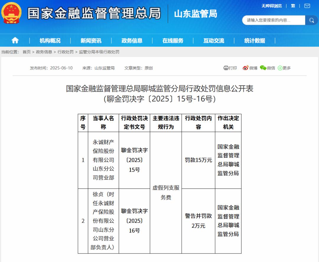比如,6月10日,国家金融监督管理总局山东监管局披露称,永诚财险山东分公司营业部因虚假列支服务费,被罚款15万元。同时,时任该机构负责人徐贞被警告并罚款2万元。
