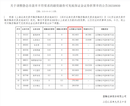 券商中国记者注意到,除了东方财富证券,东方证券和国融证券也在9月30日官网发布了类似的公告,因静态市盈率异常,将中芯国际、佰维存储、天马科技、瑞晟智能科技、曼恩斯特、宏辉果蔬、永鼎股份、路桥信息、哈空调的折算率均调整为0,上述调整自10月9日正式生效。