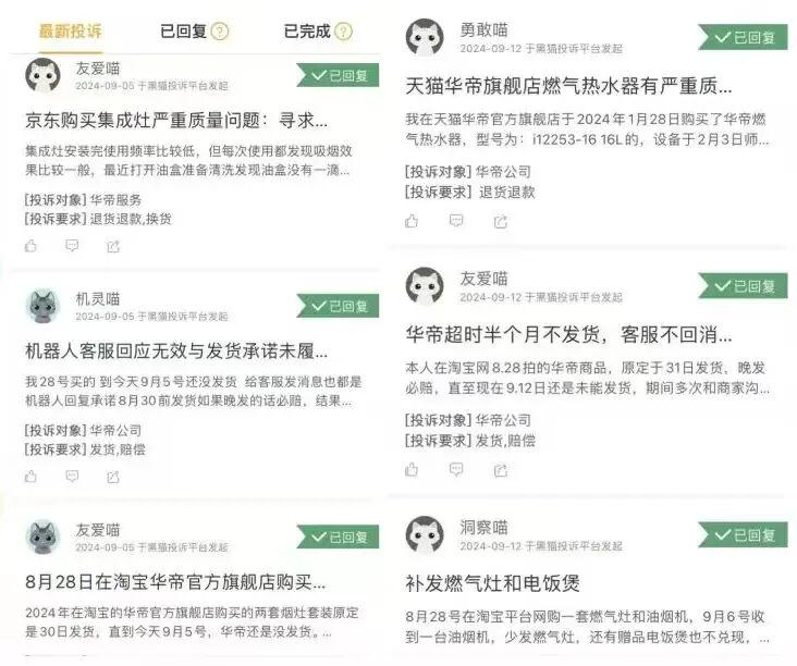在黑猫投诉平台上,华帝股份累计投诉量有数千条,多数投诉指向其厨电产品存在质量缺陷、售后维修服务不到位以及三包义务履行不力等问题。全国12315平台消费投诉信息公示系统同样显示,华帝股份新增的多件消费者投诉,主要涉及“经营者不履行三包义务”和产品涉嫌“冒充合格产品”等问题。
