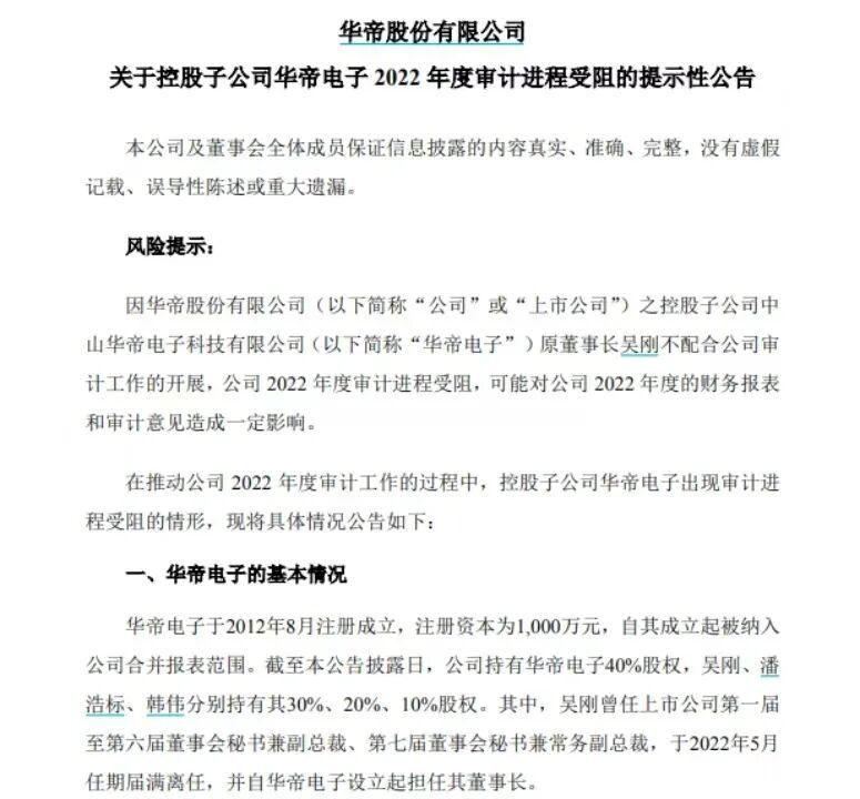 3月25日,华帝股份披露《关于控股子公司华帝电子2022年度审计进程受阻的提示性公告》称,因华帝电子原董事长吴刚不配合公司审计工作的开展,公司2022年度审计进程受阻,公司及审计机构多次与吴刚沟通,敦促其积极配合上市公司审计工作,但均沟通无果。