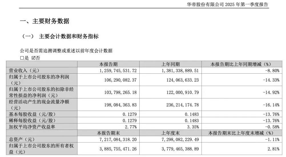 到2025年第一季度,华帝股份业绩再次双双下滑,公司营收和净利润分别为12.6亿元和1.06亿元,同比增速为-8.8%和-14.33%。