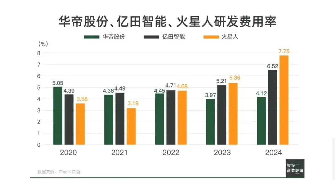这又与华帝“重营销轻研发”的经营策略息息相关。2024年,华帝股份研发投入为2.63亿元,研发费用率为4.13%,同期火星人公司研发投入为1.07亿元,研发费用率高达7.78%。