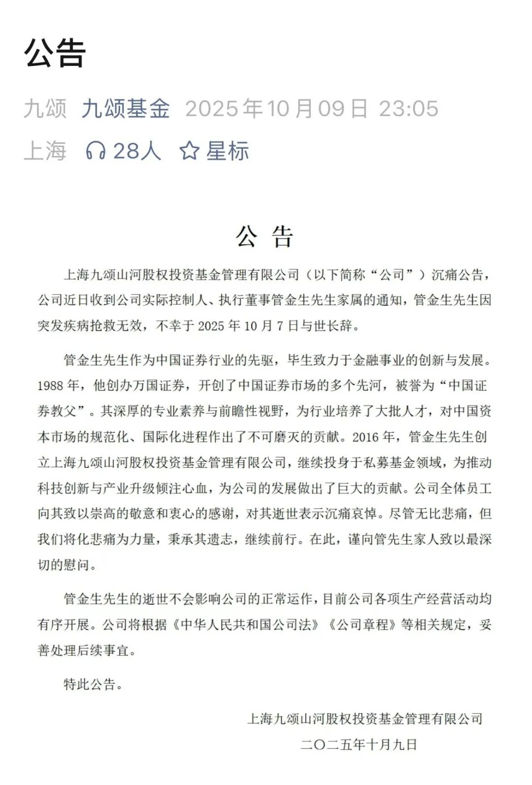 10月9日晚,九颂基金发布公告称,公司近日收到公司实际控制人、执行董事管金生家属的通知,管金生因突发疾病抢救无效,不幸于2025年10月7日与世长辞。