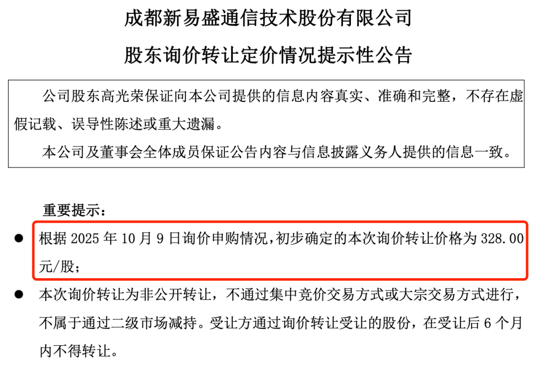 10月9日晚间,新易盛发布了《股东询价转让定价情况提示性公告》。公司称,根据10月9日询价申购情况,初步确定的本次询价转让价格为328.00元/股。