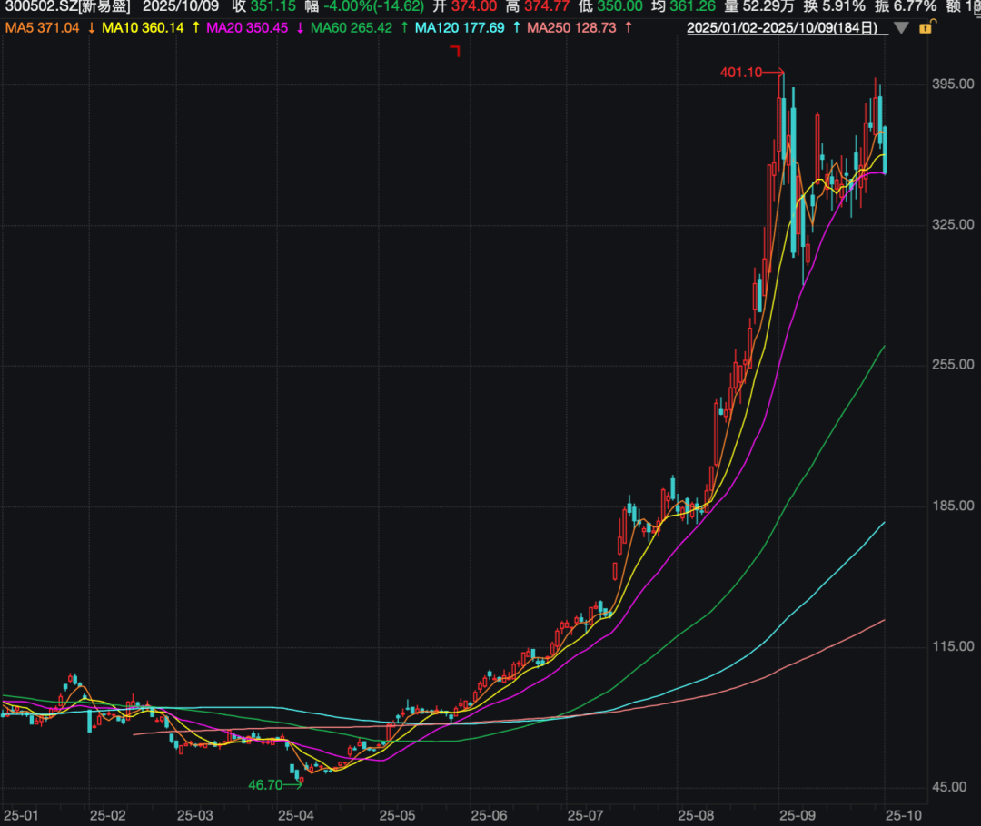 10月9日,新易盛股价低开低走,截至收盘下跌4%,报收于351.15元/股。该股年初至今涨幅超过327%,最新总市值为3490亿元。