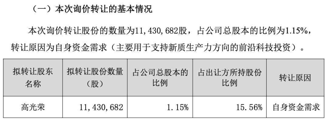 据公告披露,转让原因系自身资金需求,主要用于支持新质生产力方向的前沿科技投资。