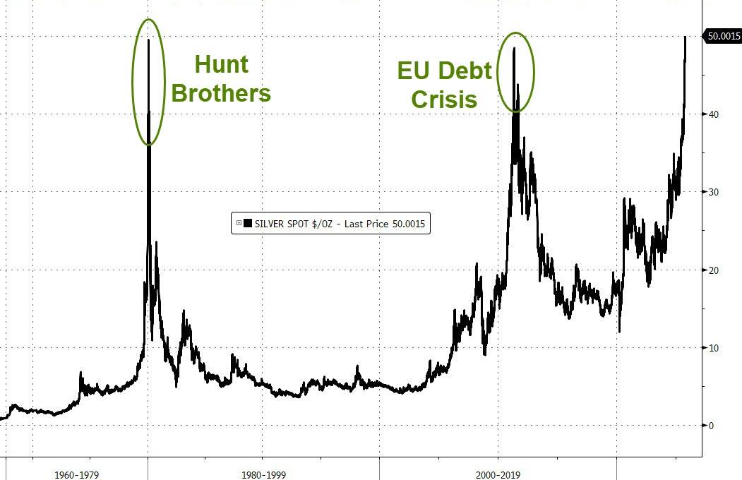 周四,现货白银站上51美元,再创新高,日内涨4.5%。这一价格水平为数十年来最高,仅次于1980年1月亨特兄弟逼空事件期间创下的历史纪录。