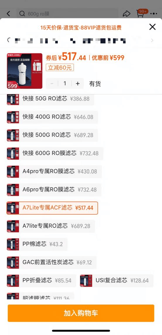 而安吉尔天猫官网所售相似材质的活性炭滤芯、PP滤芯和ACF滤芯等适用于不同机型,价格在50-500元不等。
