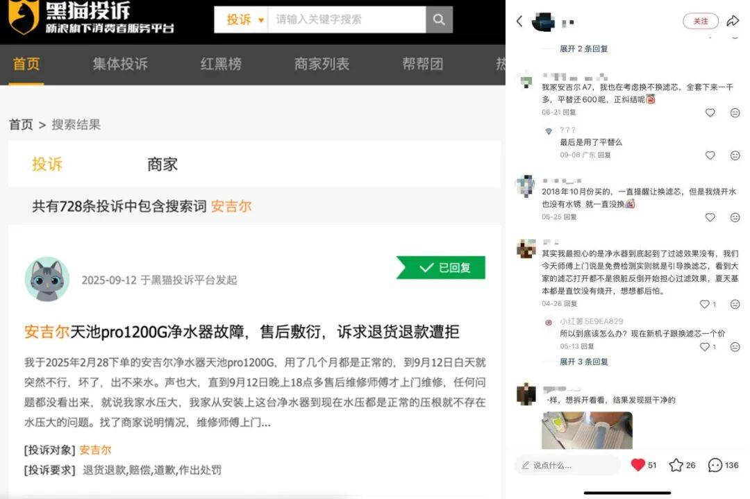 此外,「创业最前线」还注意到,在小红书、黑猫投诉等平台,也不乏关于安吉尔后续换芯成本高、售后体验不佳等吐槽。