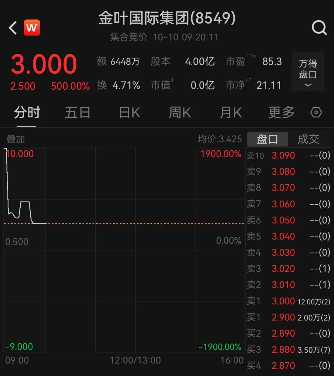 10月10日, 港股金叶国际集团IPO上市首日开盘大涨500%,报3港元/股。