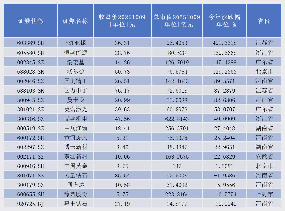 从二级市场表现看,今年以来,截至10月9日收盘,14家上市公司股价实现上涨。其中,*ST亚振、恒盛能源、潮宏基、沃尔德4家成功实现翻倍。